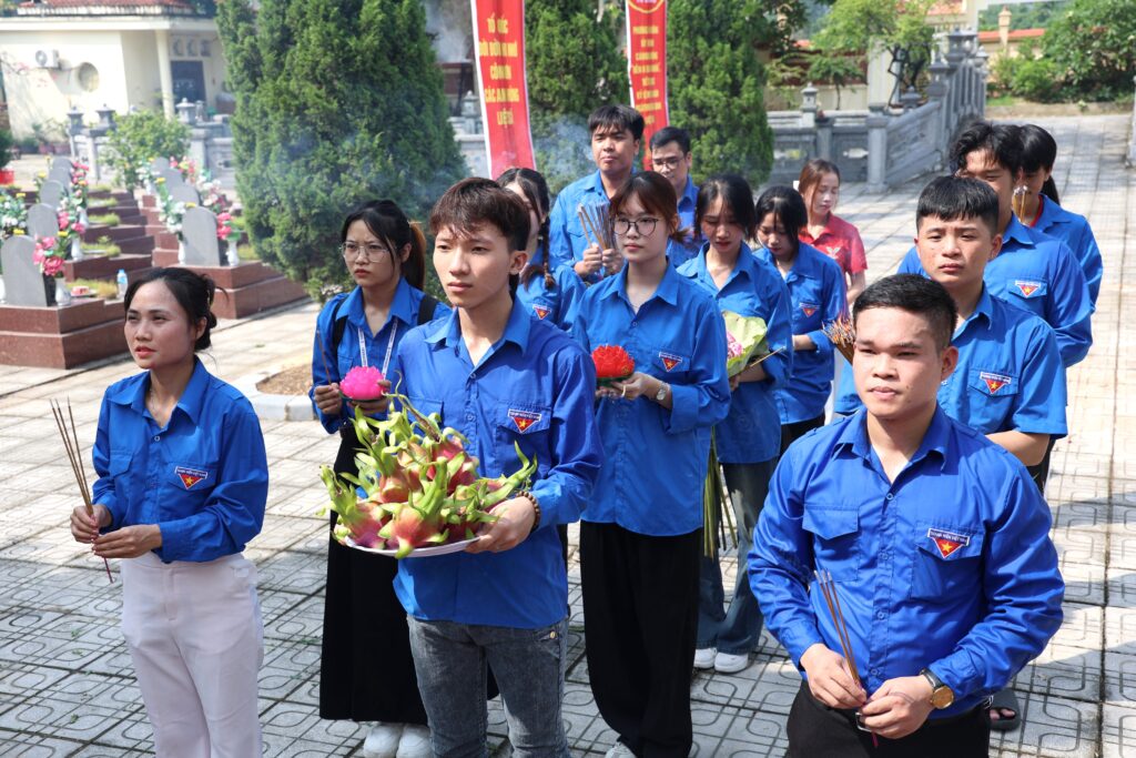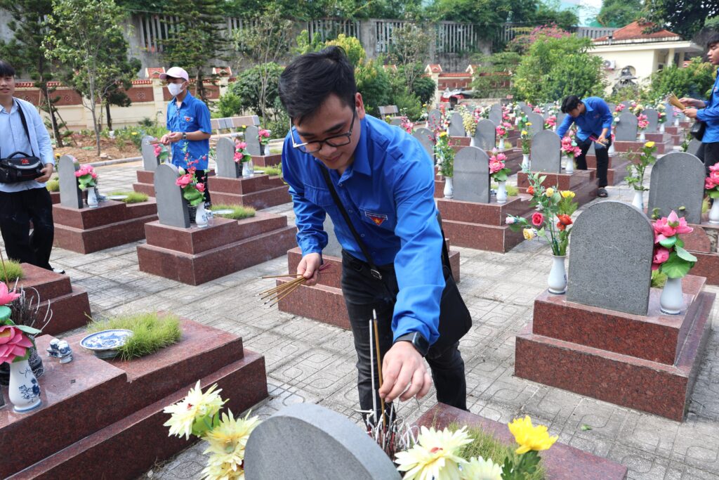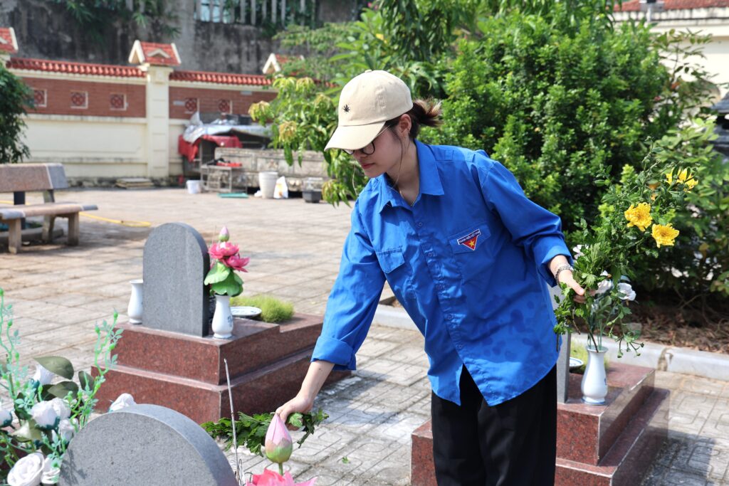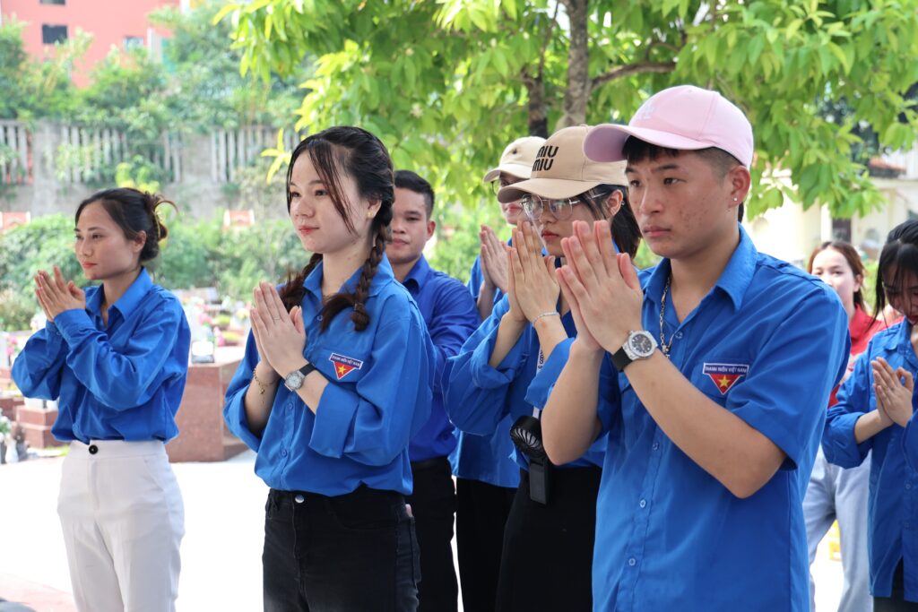 With the spirit of “When drinking water, remember its source” and “Gratitude for those who came before,” the youth of Trung Vuong University worked together to clean and beautify the cemetery grounds, offered incense in remembrance, and lit candles in honor of the fallen heroes who sacrificed their lives for the nation’s independence and freedom. The activity not only demonstrated the deep respect and gratitude of the younger generation toward their predecessors but also served as a powerful lesson in patriotism, strengthening solidarity and community responsibility among union members and students.