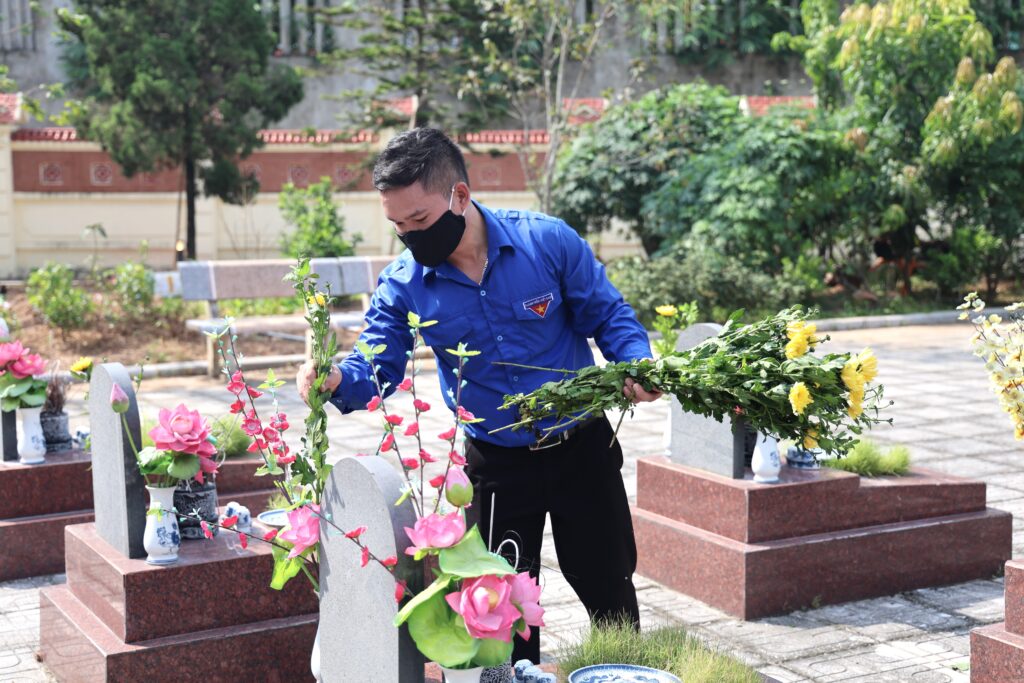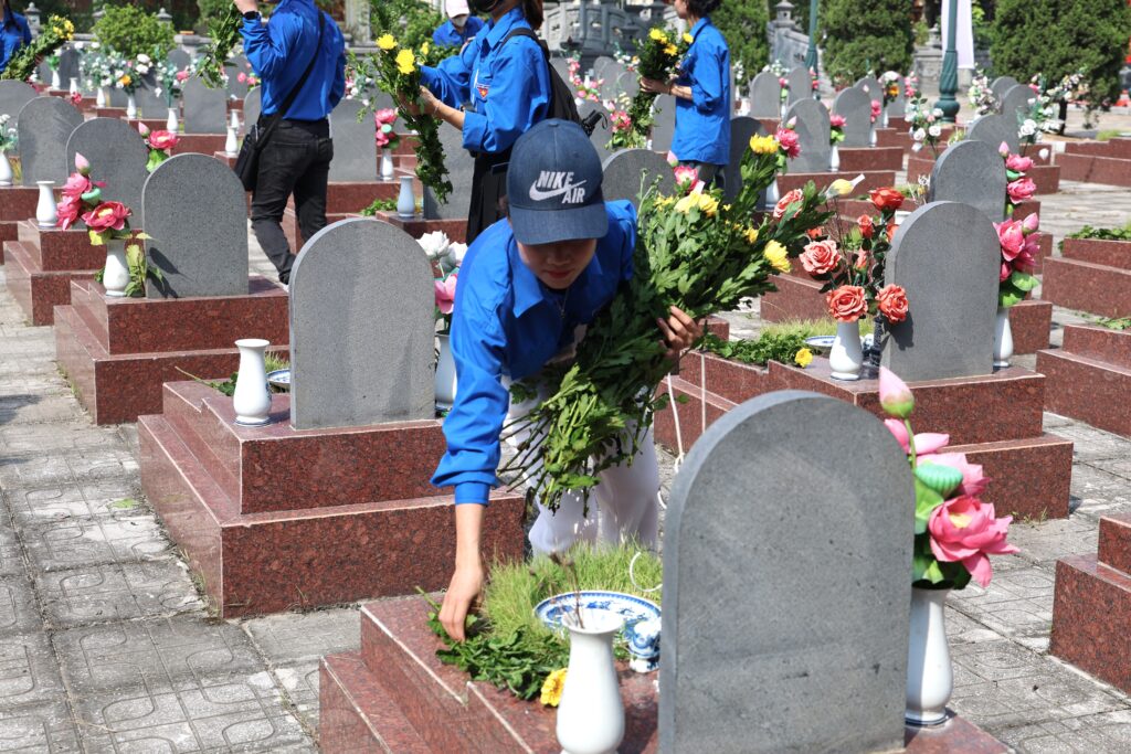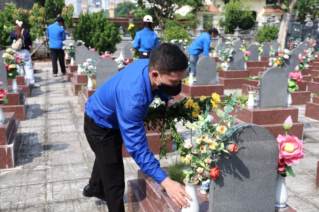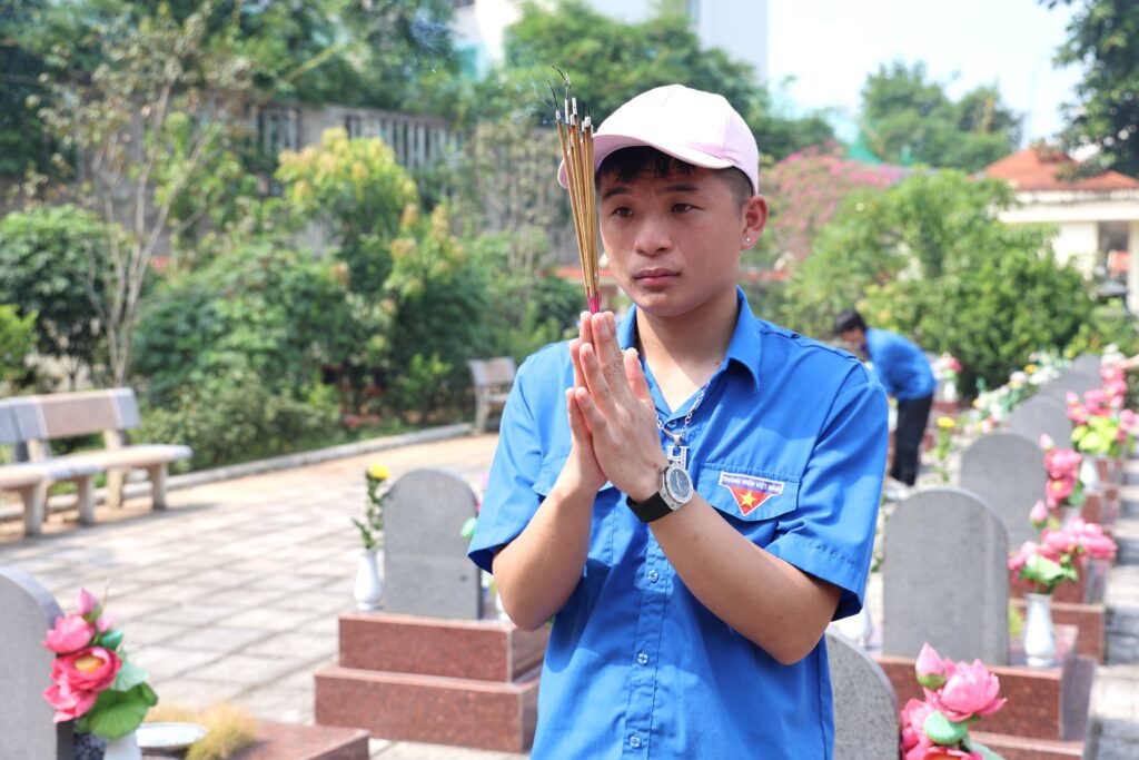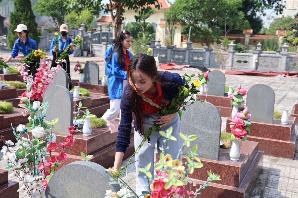 With the spirit of “When drinking water, remember its source” and “Gratitude for those who came before,” the youth of Trung Vuong University worked together to clean and beautify the cemetery grounds, offered incense in remembrance, and lit candles in honor of the fallen heroes who sacrificed their lives for the nation’s independence and freedom. The activity not only demonstrated the deep respect and gratitude of the younger generation toward their predecessors but also served as a powerful lesson in patriotism, strengthening solidarity and community responsibility among union members and students.