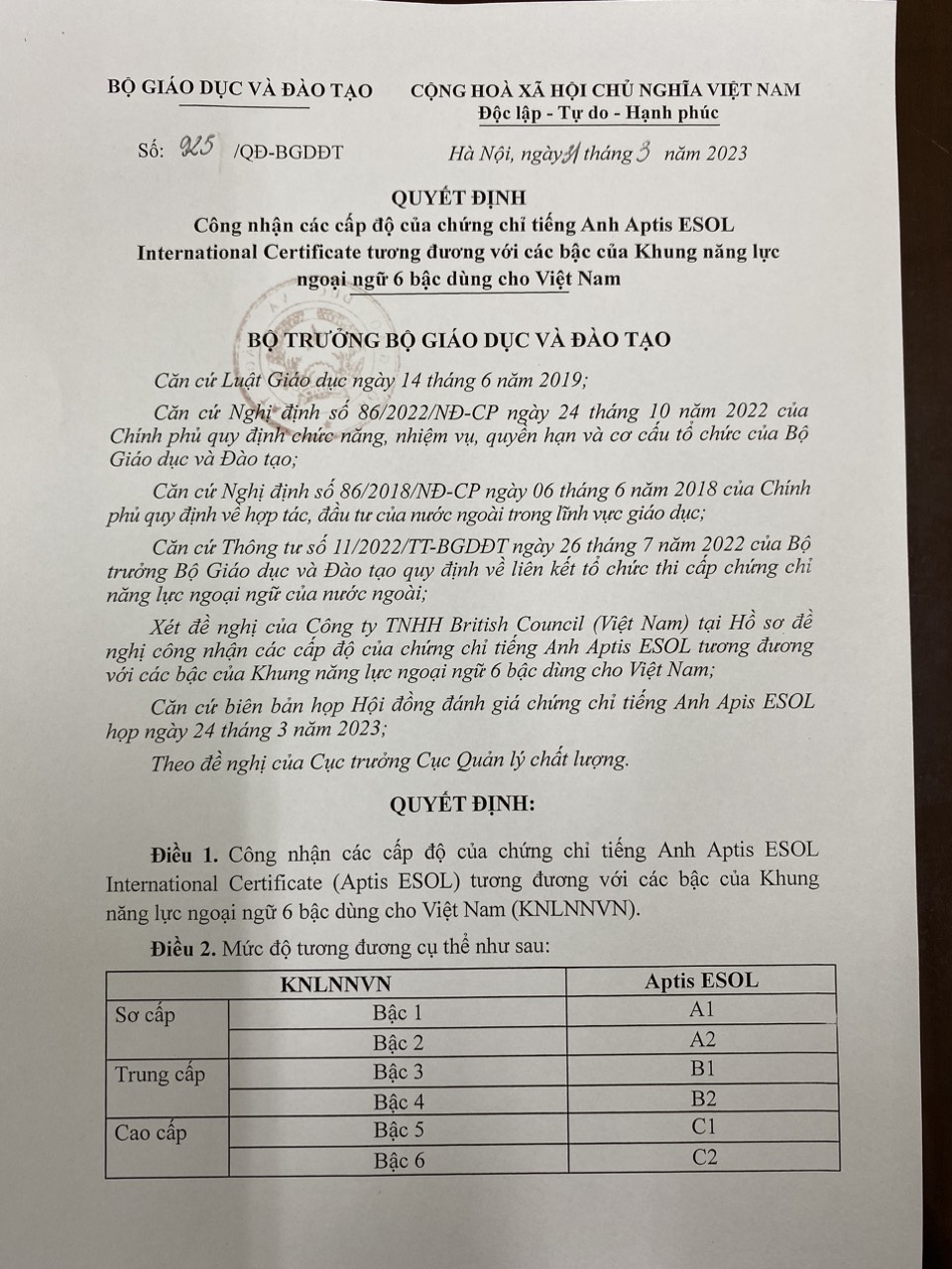 Quyết định Công nhận các cấp độ của chứng chỉ tiếng Anh Aptis ESOL International Certificate tương đương với các bậc của Khung năng lực ngoại ngữ 6 bậc dùng cho Việt Nam Posted on 2024-04-262024-05-15 by Admin web Bài viết liên quan: Thông tư ban hành Quy chế đánh giá kết quả rèn luyện của người học được đào tạo trình độ đại học hệ chính quy Quyết định Phê duyệt liên kết tổ chức thi cấp chứng chỉ tiếng Anh Linguaskill giữa Công ty Cổ phần nguyên cứu, ứng dụng và thực nghiệm công nghệ REAP và Tổng hiệu trưởng, Thạc sĩ và Học giả của Đại học Cambridge hoạt động thông qua tổ chức trực thuộc Nhà Xuất bản và Hội đồng Khảo thí Đại học Cambridge Thông tư Ban hành Quy định điều kiện, trình tự, thủ tục mở ngành đào tạo và đình chỉ tuyển sinh, thu hồi quyết định mở ngành đào tạo trình độ đại học Thông tư Quy định điều kiện, trình tự, thủ tục mở ngành đào tạo, đình chỉ hoạt động của ngành đào tạo trình độ đại học, thạc sĩ, tiến sĩ
