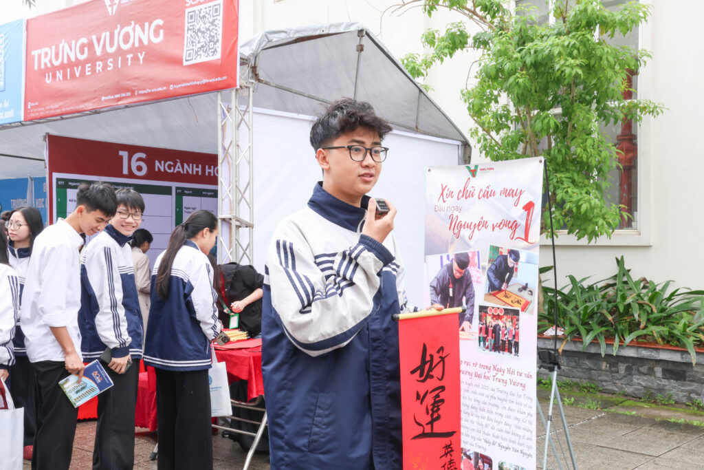 Khác biệt hoàn toàn với các gian tư vấn khác, Trường Đại học Trưng Vương mang đến không gian văn hóa đặc sắc với sự hiện diện của Thầy đồ Nguyễn Văn Nguyên – Giảng viên Khoa Ngoại ngữ. Những bức thư pháp may mắn trở thành món quà tinh thần ý nghĩa, gửi gắm những lời chúc thành công tới các sĩ tử.