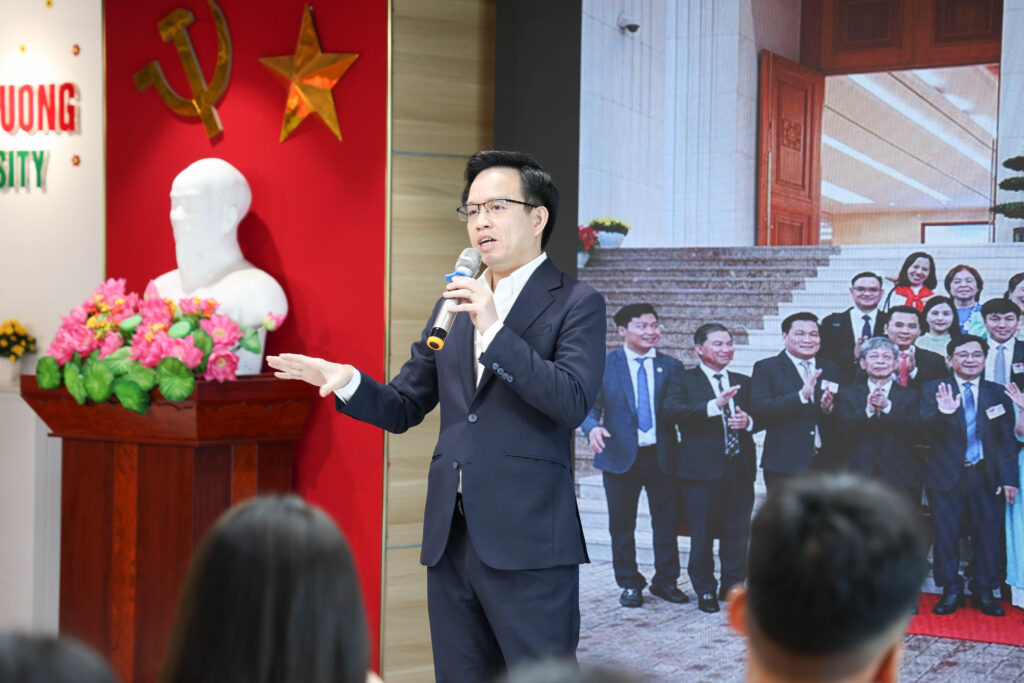 Ông Nguyễn Duy Ninh – Tổng giám đốc khối dịch vụ Tập đoàn Hồ Gươm – Phó Chủ tịch HĐT gửi lời chào mừng nồng nhiệt đến tân sinh viên K16, đồng thời nhấn mạnh khát vọng xây dựng môi trường học tập chất lượng, gắn kết với thực tiễn xã hội.