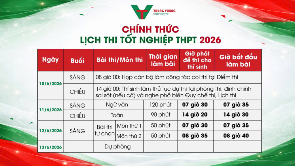 Kỳ thi thi tốt nghiệp THPT 2026 đã được Bộ Giáo dục và Đào tạo chính thức công bố với nhiều thông tin quan trọng. Việc nắm rõ lịch thi, thời gian đăng ký và công bố điểm trong kỳ thi tốt nghiệp THPT sẽ giúp thí sinh chủ động xây dựng kế hoạch ôn tập hiệu quả. Đồng hành cùng sĩ tử, Trường Đại học Trưng Vương tổng hợp những cập nhật mới nhất để bạn sẵn sàng bước vào kỳ thi quan trọng này.