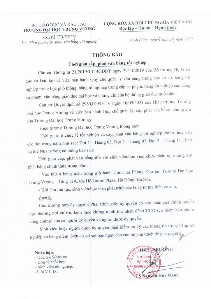 Thông báo về thời gian cấp, phát văn bằng tốt nghiệp