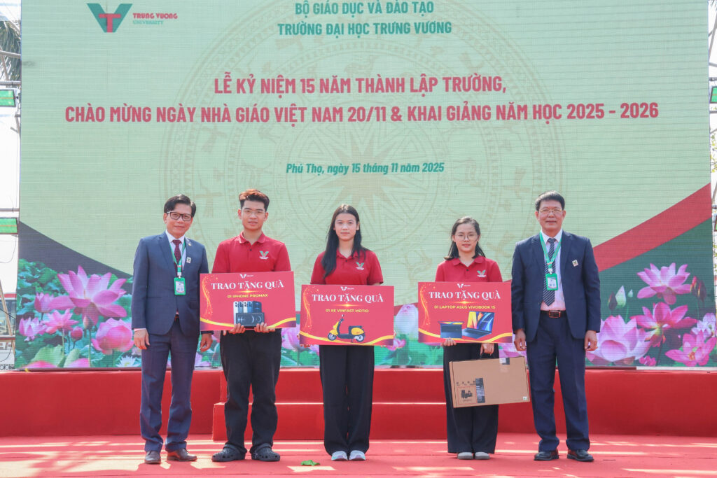 Một trong những điểm nhấn của chương trình là phần trao học bổng và quà tặng cho tân sinh viên xuất sắc, những tràng pháo tay vang lên khi Nhà trường trao học bổng và quà tặng giá trị như iPhone, laptop và xe máy điện VinFast cho các tân sinh viên Khóa 16. Những gương mặt trẻ – đầy háo hức và quyết tâm – đã đại diện cho thế hệ mới của Trưng Vương bước lên sân khấu trong niềm vui hân hoan.