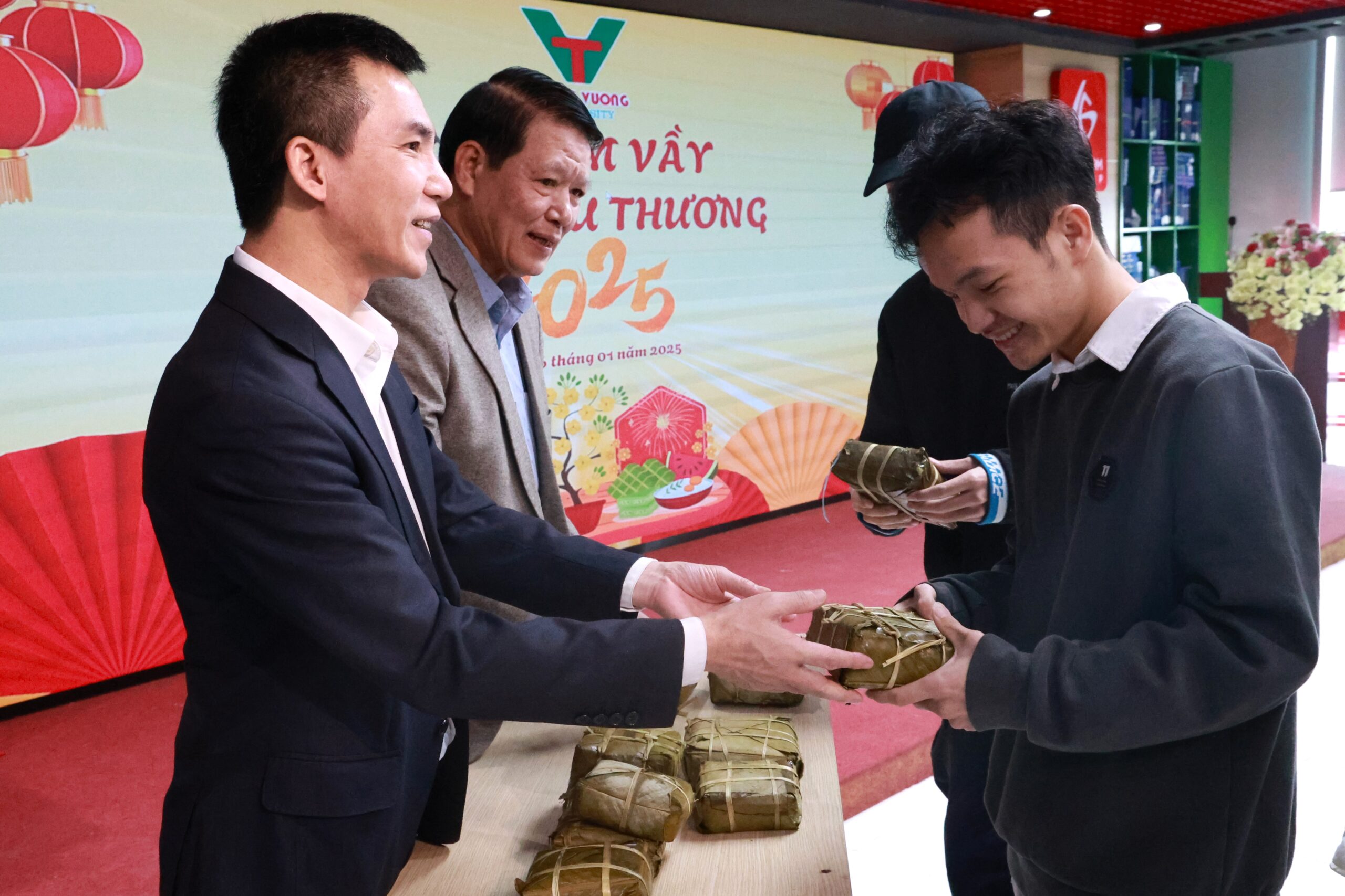 Đặc biệt, những chiếc bánh chưng được trao tặng là thành phẩm từ cuộc thi gói bánh chưng trong khuôn khổ chương trình “Xuân Yêu Thương 2025” do chính sinh viên nhà trường thực hiện. Điều này càng làm tăng thêm ý nghĩa của món quà Tết, thể hiện sự gắn kết và tinh thần tương thân tương ái trong cộng đồng TVUNI.