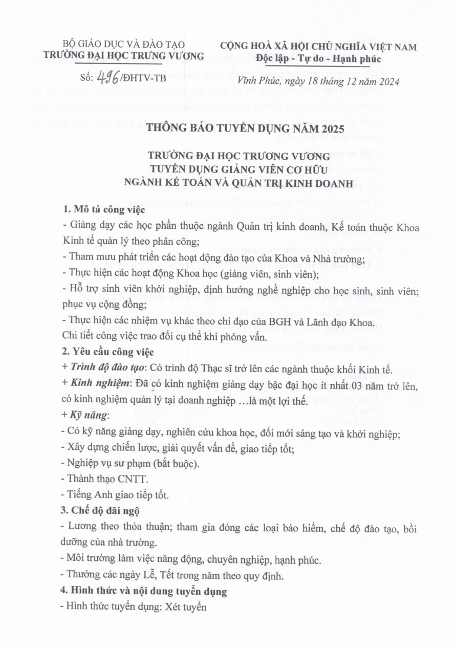 Trường Đại học Trưng Vương trân trọng thông báo tuyển dụng giảng viên cơ hữu các ngành Kế toán và Quản trị kinh doanh, cụ thể như sau: