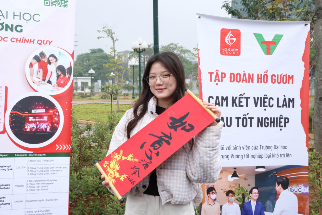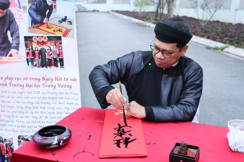 Một trong những yếu tố tạo nên sự khác biệt của tuyển sinh Trường Đại học Trưng Vương tại ngày hội là hoạt động viết thư pháp cầu may.